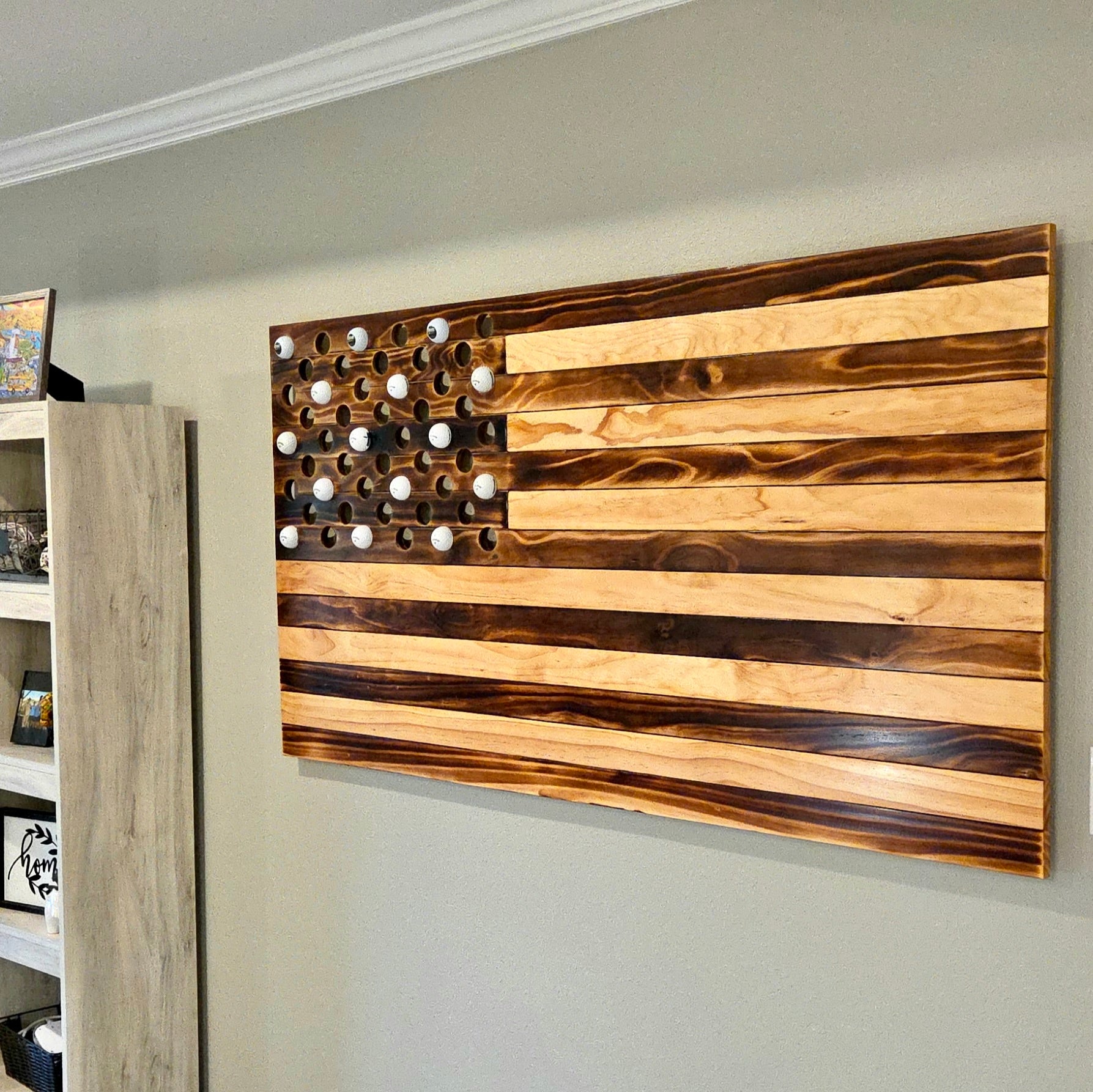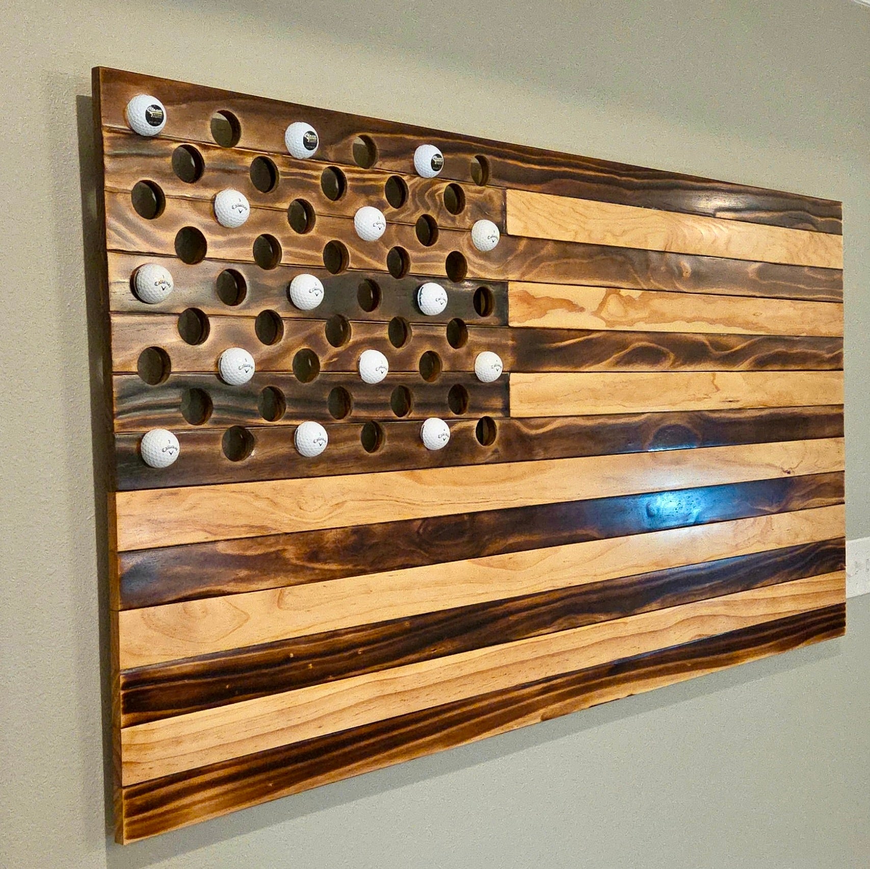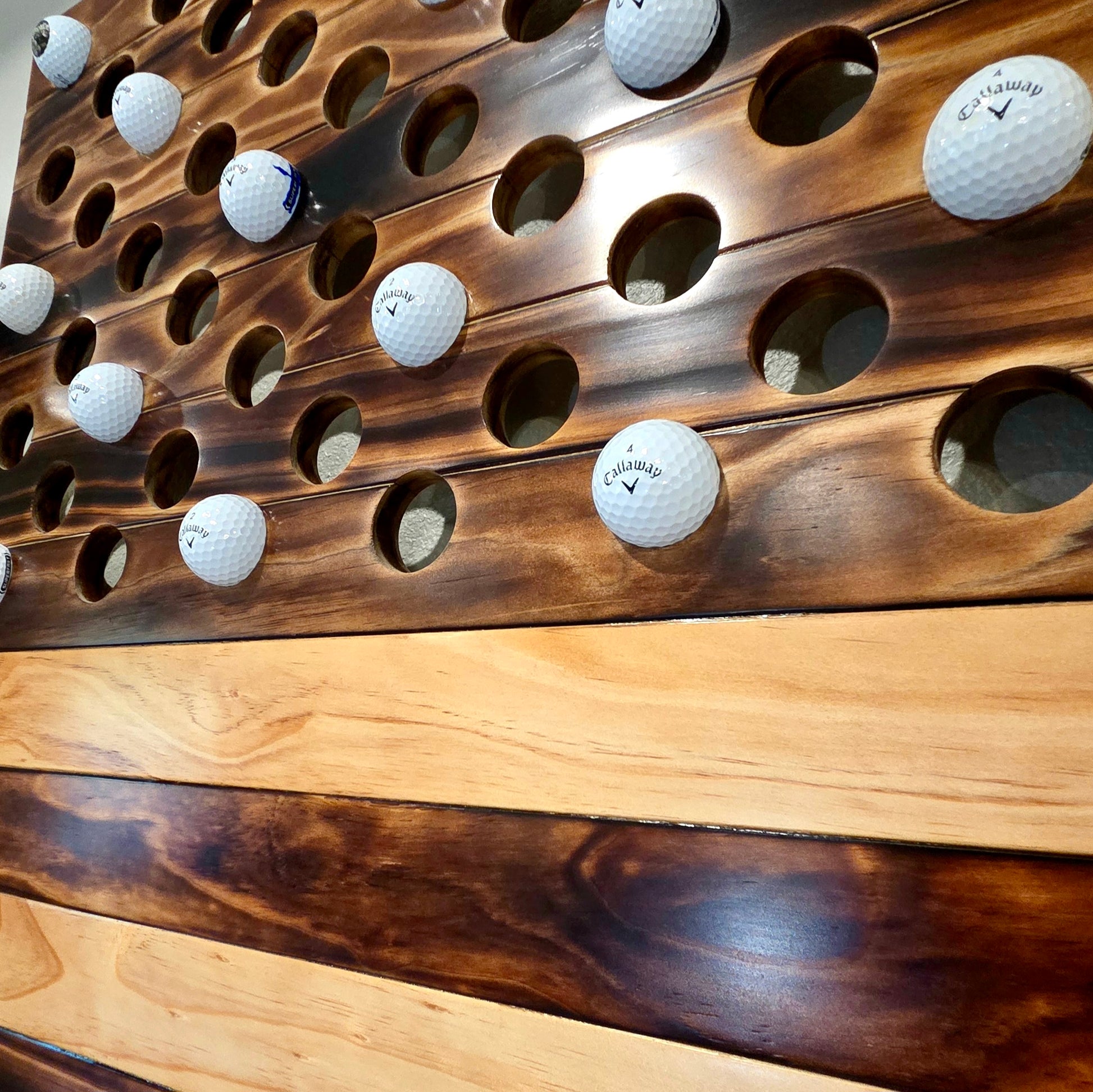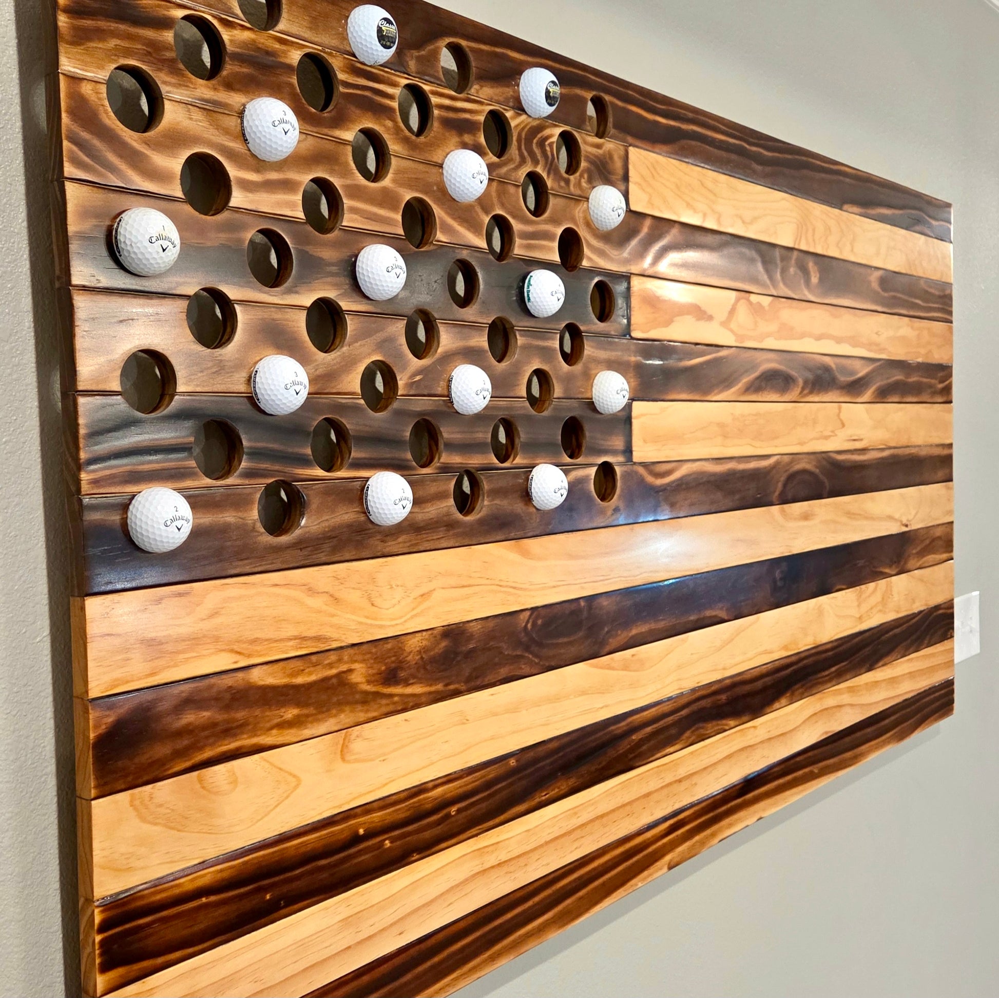 Where stars would appear on a traditional flag, this piece features press-fit holes that securely hold your golf balls—whether you're tracking all 50 states, hole-in-ones, or memorable course logos.