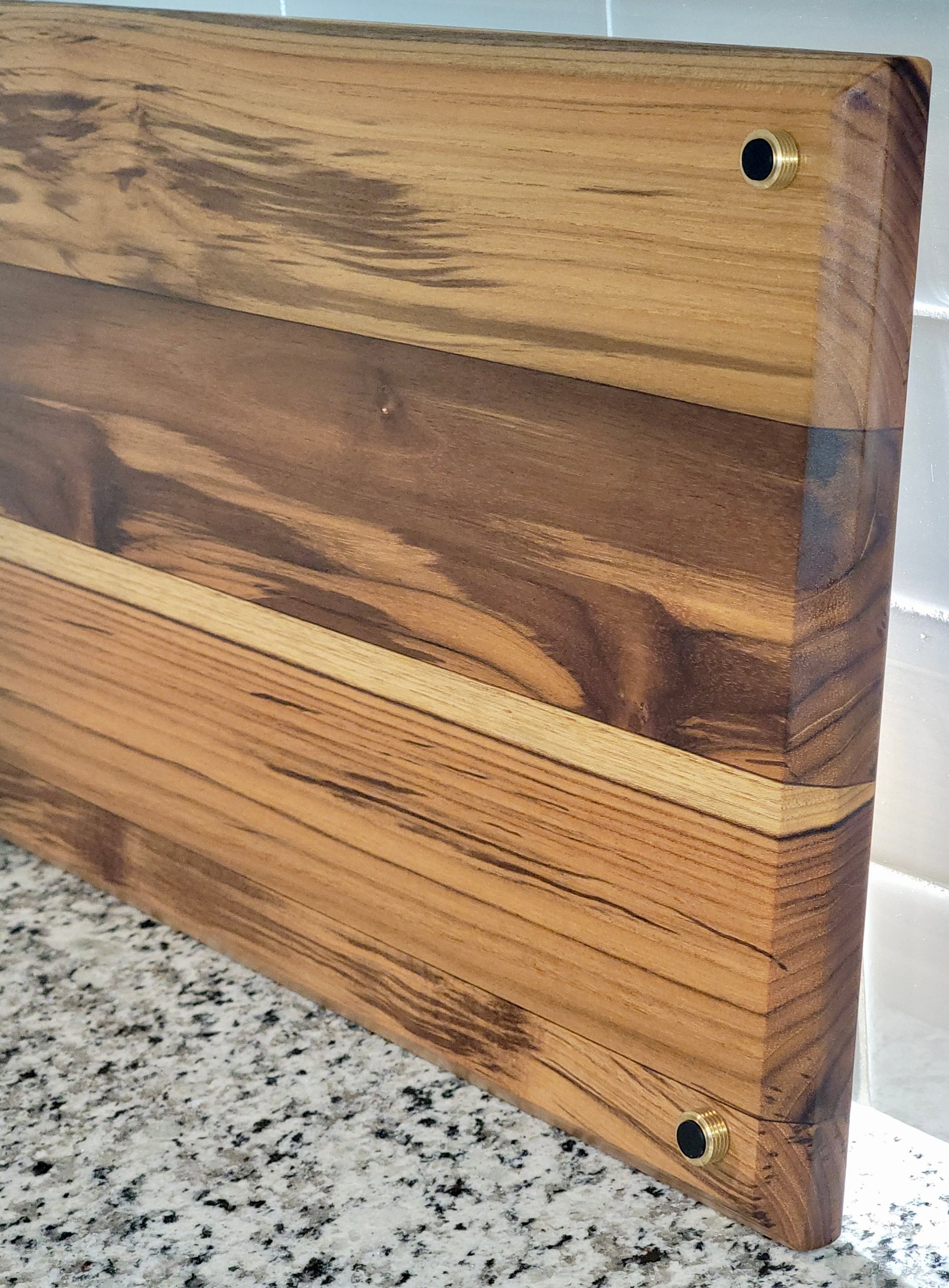 The board is thoughtfully designed with steep chamfered edges for easy maneuvering, making it simple to lift or move during food prep. Features brass feet with rubber pads are added to protect both the cutting board and your countertops, preventing any slipping and offering stability during use.